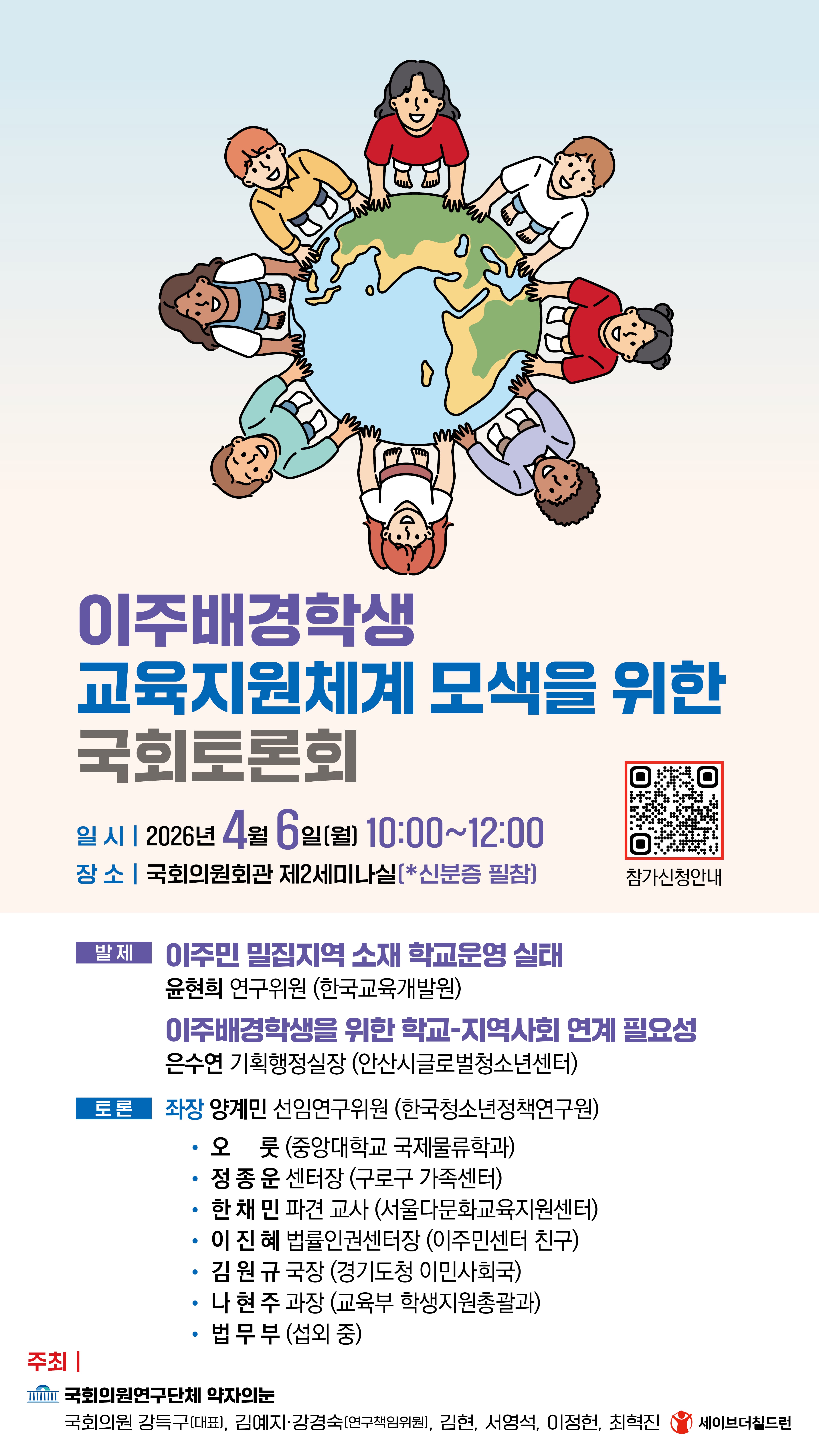 - 주최: 국회의원연구단체 약자의눈(국회의원 강득구[대표], 김예지·강경숙[연구책임위원], 김현, 서영석, 이정헌, 최혁진), 세이브더칠드런