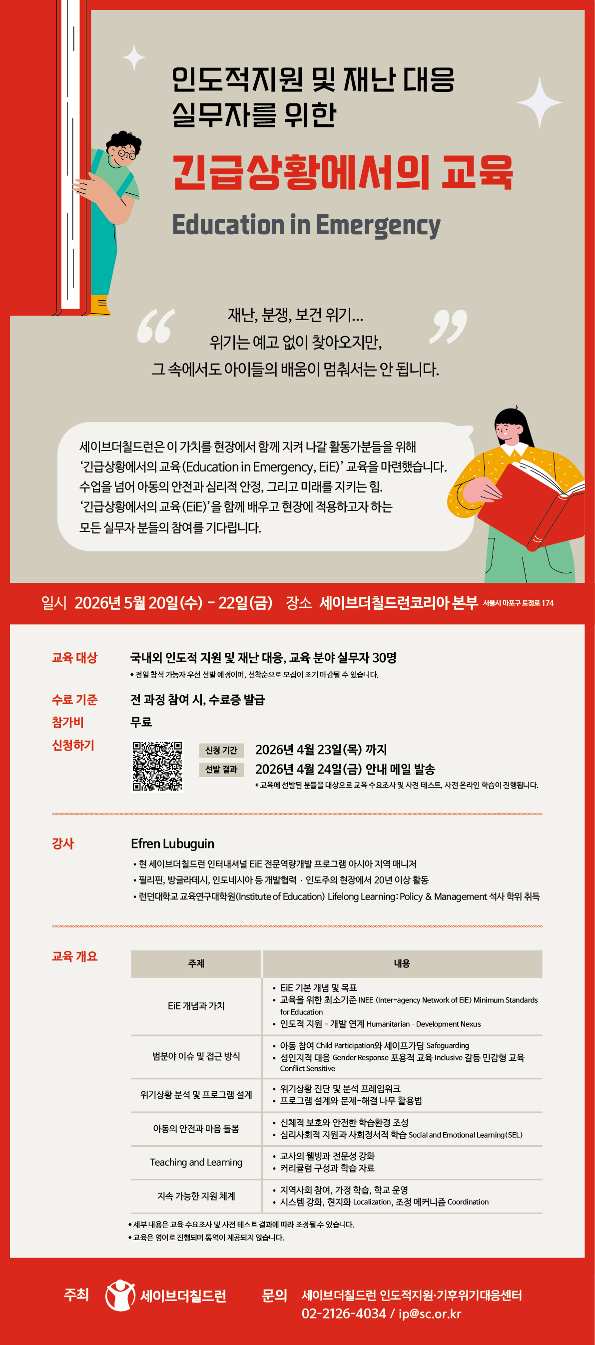 국제아동권리 NGO 세이브더칠드런은 분쟁, 재난 등 위기 상황 속에서 아동을 구하고 신속한 회복과 발달을 돕는 ‘긴급상황에서의 교육(Education in Emergency, EiE)’ 교육을 개최합니다.