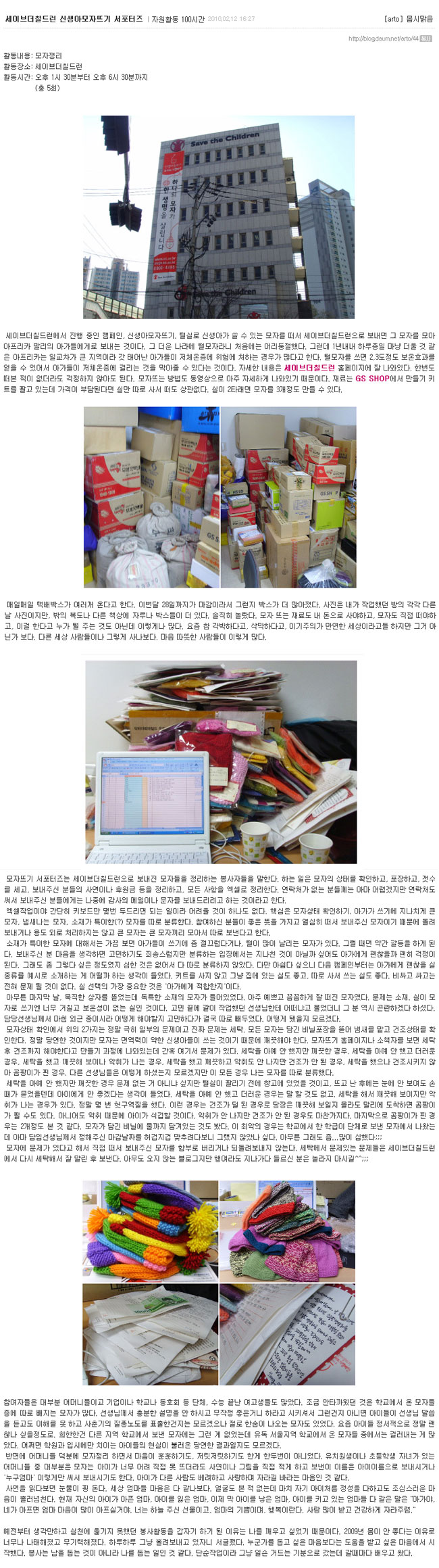 아래 글은 모자뜨기 캠페인 season3 의 모자정리를 도와주신 허*경 님께서 모자뜨기 캠페인 자원봉사 활동에 참여하신 후기를 홈페이지에 올려주신 글입니다. 모자정리를 하면서의 체험담을 자세히 기록해 주셨습니다.