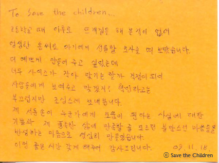 사진/ 서툰 솜씨로라도 아이들에게 도움이 되어 기쁘다는 모자 후원자님의 사연