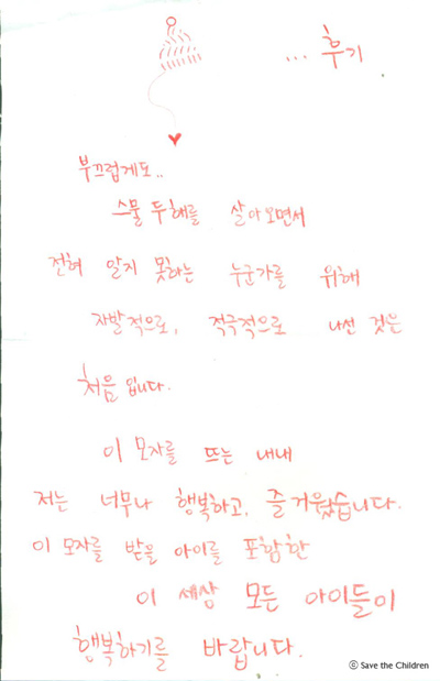 시즌 4가 끝나는 2011년 3월 15일까지 주중 매일 오후 2시 <신생아 살리기 모자뜨기 캠페인> 시즌2와 시즌3에 참여해주신 모자 후원자님의 사연을 소개합니다.