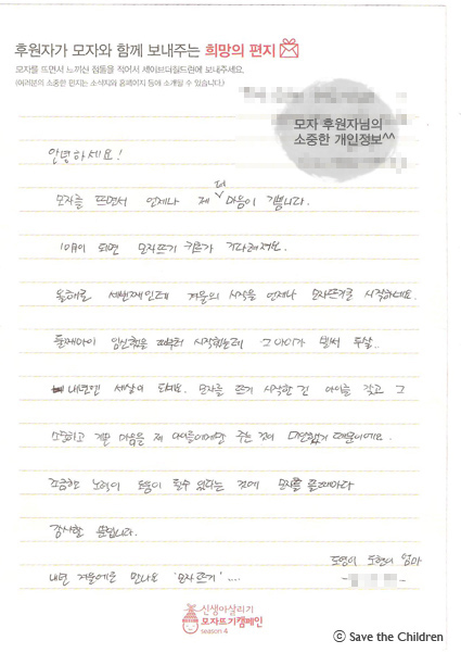 오늘은 시즌4에 참여하신 모자 후원자님께서 보내주신 사연입니다.