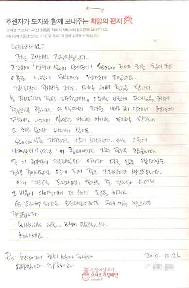 오늘은 시즌 4에 참여하신 모자 후원자님의 따뜻한 사연입니다.