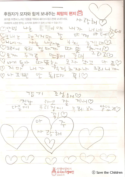 사진/ 모자 후원자님의 어린 자녀 분께서 보내주신 소중한 사연