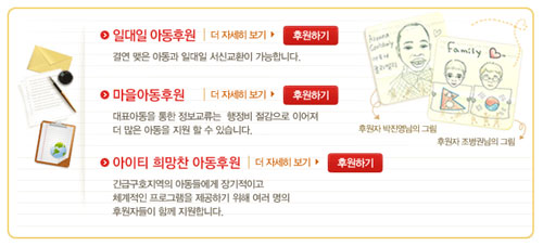 지구촌 어딘가에 후원자님의 또 다른 가족이 있습니다. 지구 반대편, 혹은 그리 멀지 않은 곳에서 질적인 영양분과 보건진료, 공부할 수 있는 책과 교실이 필요한 어린이들이 더 나은 내일을 꿈꾸며 살아가고 있습니다. 일대일 해외아동후원을 하시면 후원자님의 새로운 가족, 결연아동의 성장과정을 함께 하며 그 꿈을 응원할 수 있습니다. 서신이나 방문을 통한 교류는 아동의 성장 및 발달에 큰 도움이 됩니다. 후원자님과 한 아동의 삶에 생기는 변화, 지금 시작해보세요.