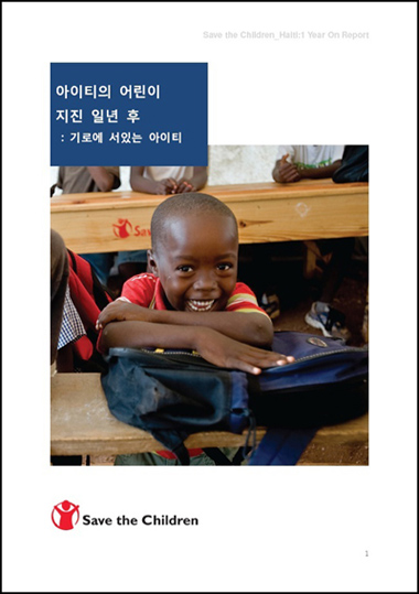 2011년 1월 12일은 23만여 명이 사망, 40만 가구를 파괴시키고 200만 명의 주민을 노숙자로 만들어버린 지진이 발생한지 정확히 1년이 되는 날입니다. 현재 1백만 명 이상이 여전히 텐트촌에 거주하고 있으며 이 중 약 50만 명은 어린이 입니다. 설상가상으로, 복구활동을 무력화시키고 더 많은 어린이들을 위협하는 콜레라가 전국을 휩쓸었습니다. 콜레라 발생으로 인해 복구활동이 되어야 할 대응들은 여전히 긴급구호 단계에 머물러 있습니다. 진척은 더딥니다. 그러나 세이브더칠드런은 수많은 성과를 목격해 왔습니다. 국제사회의 지속적인 지원과 아이티 정부의 통솔력이 있다면 아이티는 더 굳건하고 나은 국가를 재건할 수 있을 것입니다. 아이티 어린이들과 그 가족들의 필요를 충족할 수 있는 국가 말입니다.