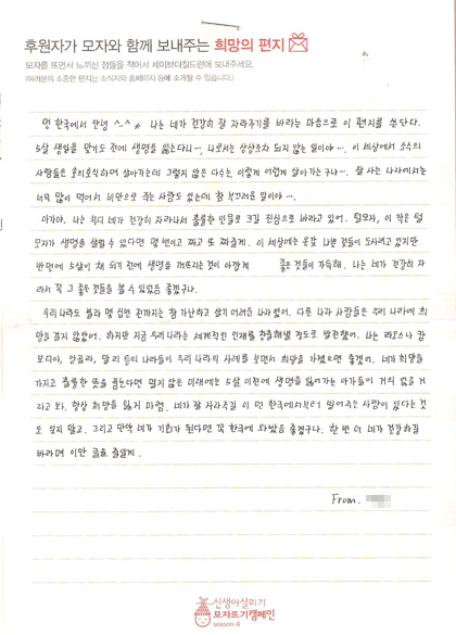 오늘은 시즌 4 참여하신 모자 후원자님께서 보내 주신 따뜻한 사연입니다.