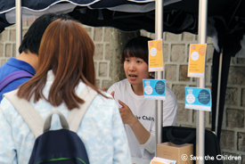 체험을 통해 문제를 인식한 분들께는 서명을 요청 드려요. 서명용지에는 아이들을 돕기 위한 보건의료담당자(health worker)을 양성해달라는 메시지가 적혀 있어요. 아이들에게 약품이나 병원을 제공하는 것도 중요하지만, 그보다 더 중요한 것은 의사나 간호사, 조산사 같은 보건의료담당자가 더 가까이에 있어 손쉽게 치료를 받을 수 있어야 한다는 점이거든요! 그래서 저희는 전 세계적으로 350만 명의 의료진이 부족하다는 메시지를 전달하며, 사람들에게 보건의료담당자 양성을 위한 지지서명을 받고 있습니다.