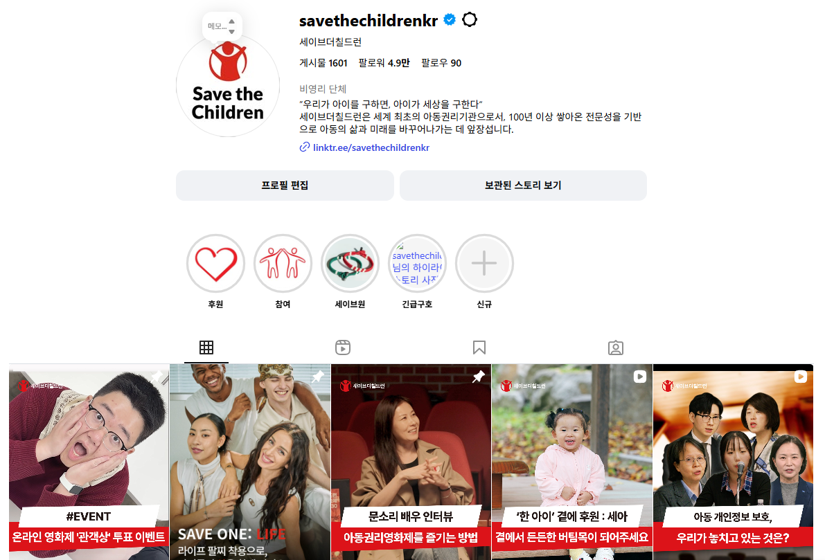 ▲ 청개구리, 욤욤(커뮤니케이션부문)님의 손길이 닿은 세이브더칠드런의 인스타그램 계정