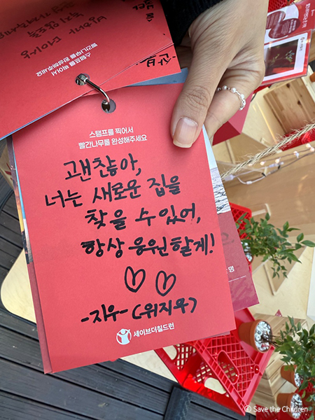 빨간나무가 자리한 부스에 방문한 참여자들은 가뭄, 폭염, 산불 등의 기후재난을 알리는 카드를 통해 기후위기 속 아이들의 현실을 이해하고, 응원 메시지를 빨간나무에 매달며 희망을 전했습니다. 그리고 천여 명의 참여자들의 마음이 순간의 결심에 그치지 않고, 오래 기억될 수 있도록 세이브더칠드런은 집에서 키울 수 있는 빨간나무(남천)를 선물했죠.